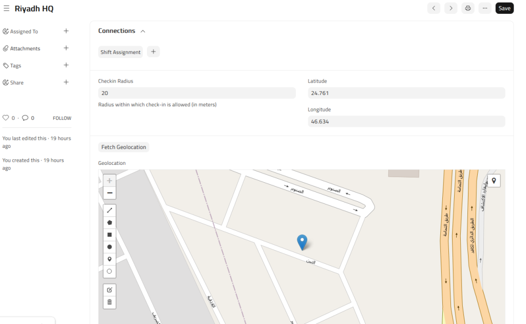 حدد مواقع الدوام المحدد لكل شركة او للفرع أو المشروع و حدد الموظفين المعينيين للدوام في الموقع. كما يمكنك تحديد المسافة من الموقع للسماح بالتسجيل للحضور والانصراف. مباشرة من ERPNext بدون استخدام أي نظام من أي طرف ثالث. واسمح للموظفين بالتسجيل مباشرة عبر المتصفح من الجوال لتسجيل الحضور والانصراف و عمليات الموارد البشرية كاملة بدون حدود